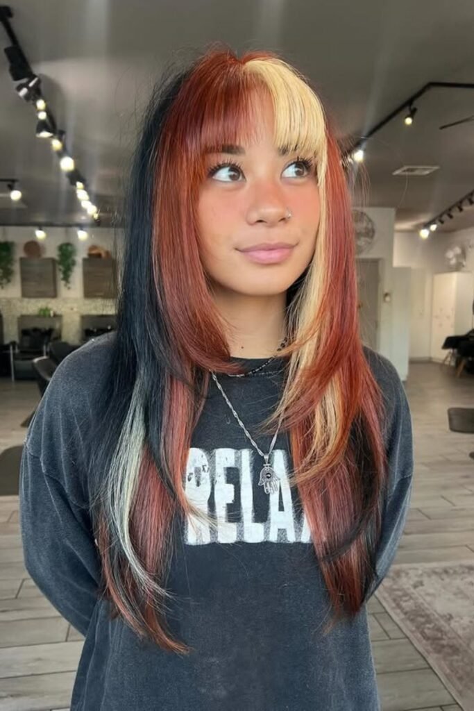 To get the same look, ask your stylist to separate the fringe first, then build the blonde and copper panels around your natural part so that they are clearly separated.