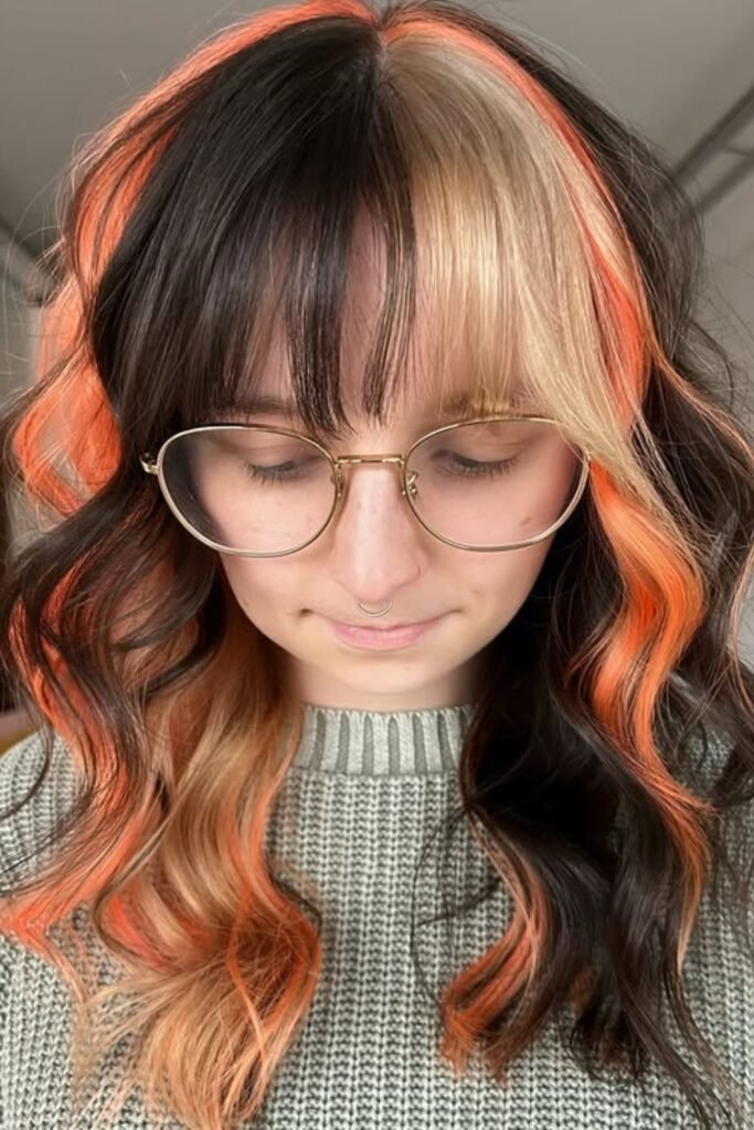 Black roots make neon orange and pale blonde show their full punch, which works well if you want a calico look that’s bold even without styling.