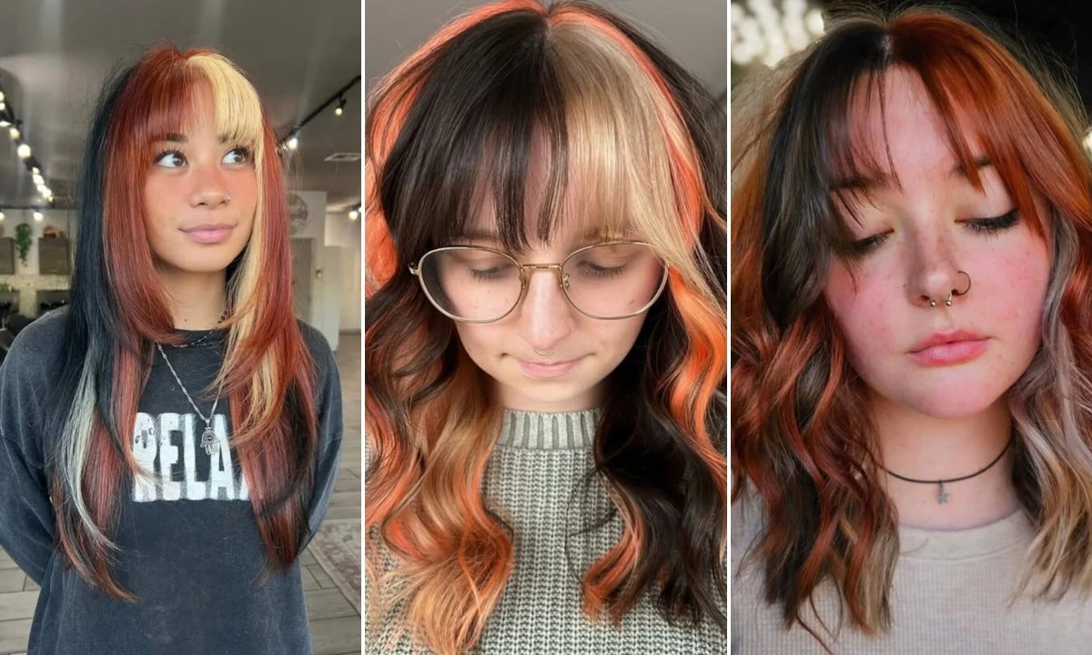 To get the same look, ask your stylist to separate the fringe first, then build the blonde and copper panels around your natural part so that they are clearly separated.