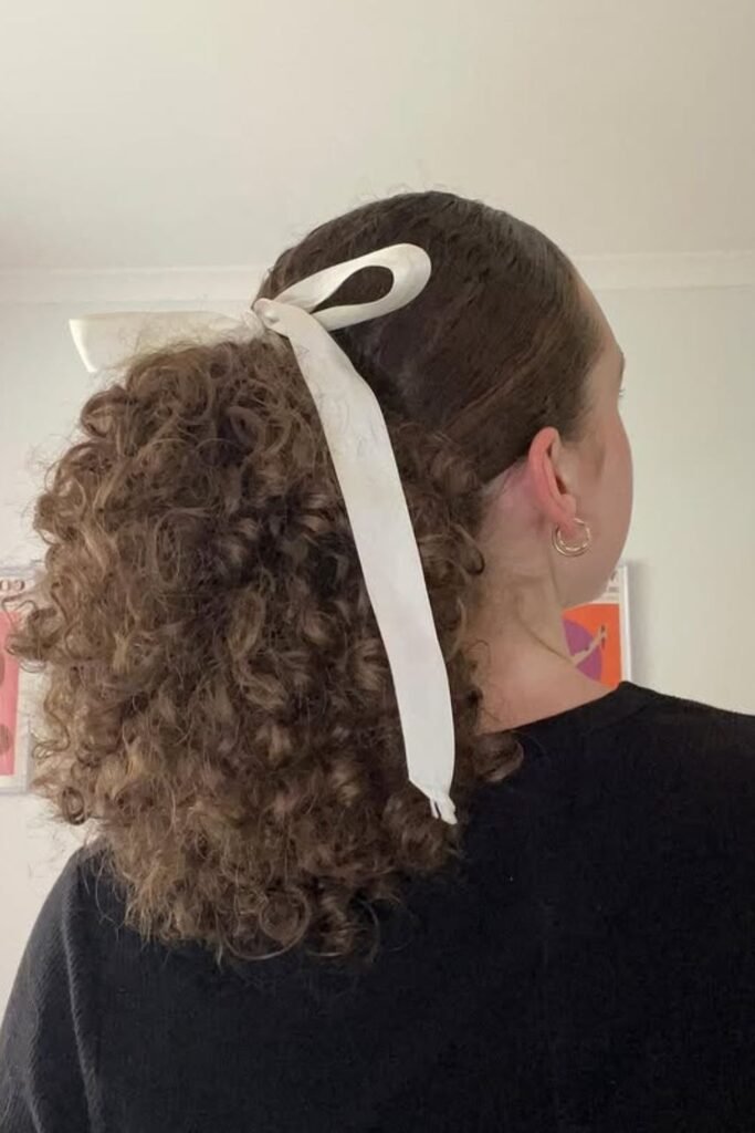 The white ribbon gives the outfit a clean look that goes with any color. To make it again, pull the top half of your hair up and tie it high with an elastic.