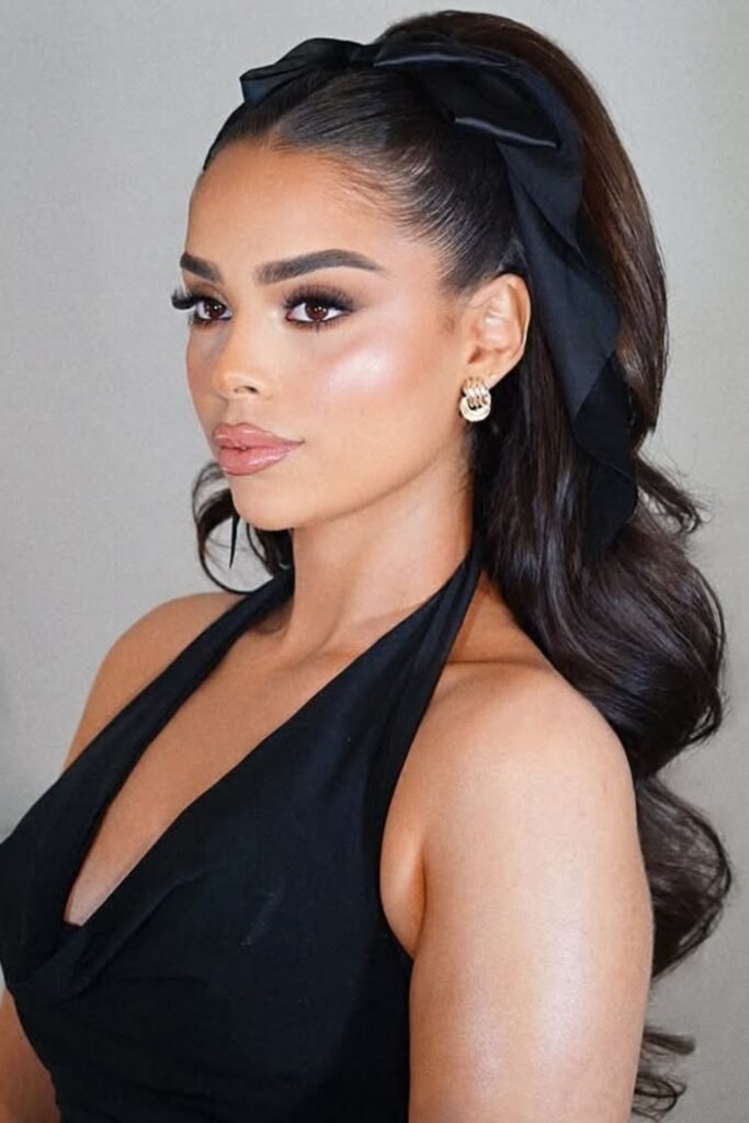 To make it softer, leave a few strands loose around your face. Then, tie a bow over the elastic.