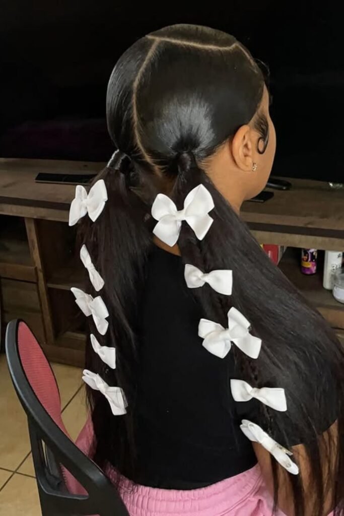 The clean look of the central portion is balanced off by the stacked white bows on each pony. To make it, split your hair down the middle and knot two low ponytails.