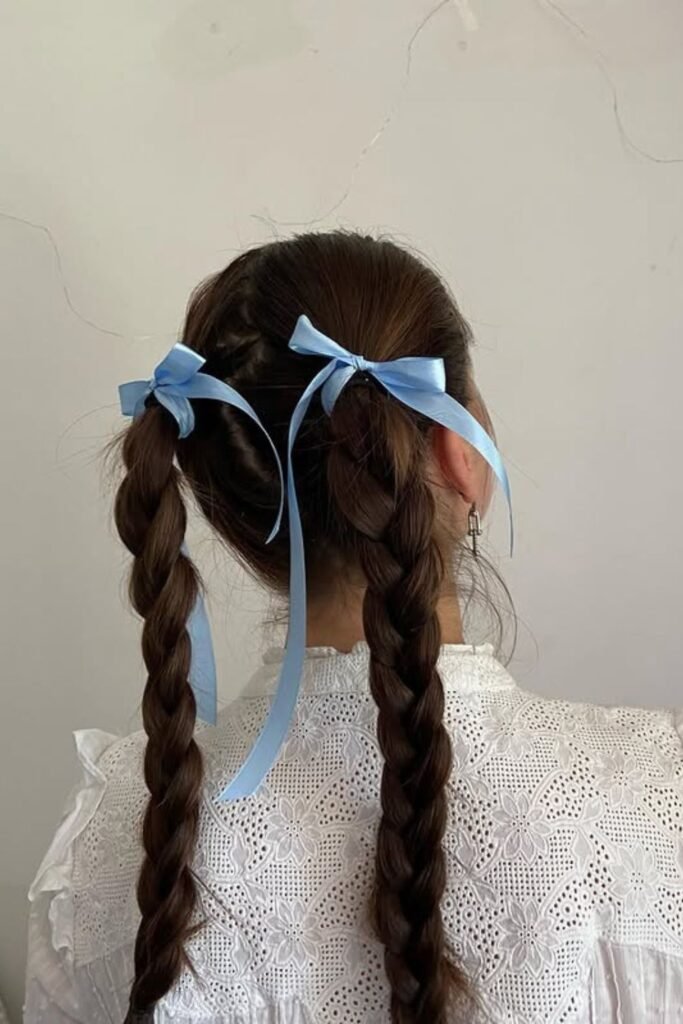 The sky-blue ribbons stand out brilliantly against dark hair, giving it a playful, coordinated look.
