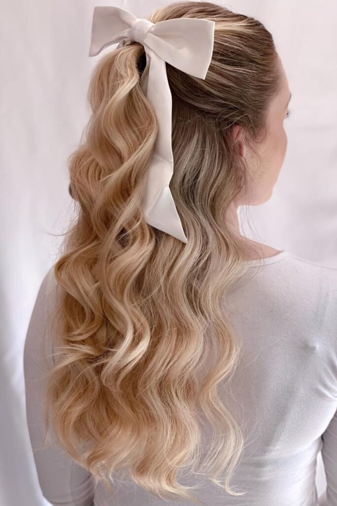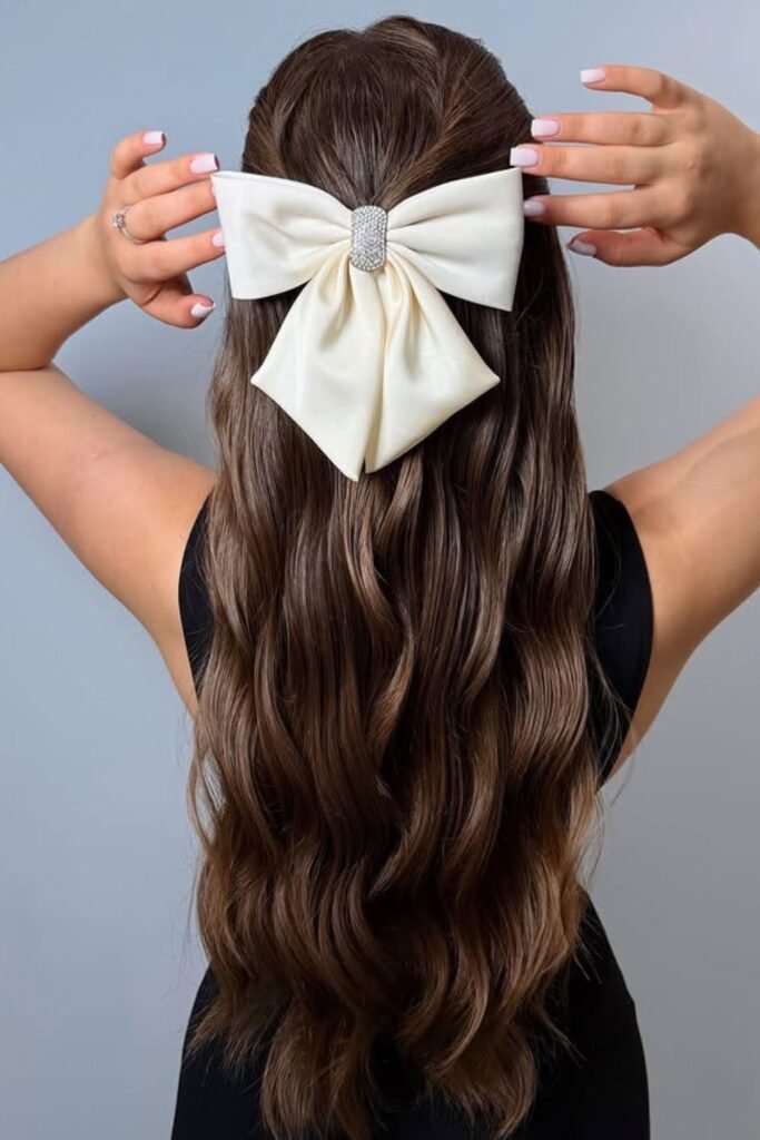 Simplicity turns striking with this half-up look topped by a wide ivory bow perfect for award ceremonies, showcases, or cheer portraits.