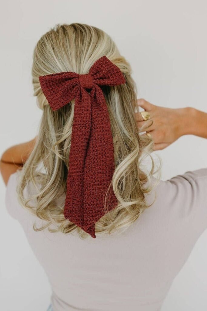 The deep burgundy bow creates contrast against lighter hair and links the whole look together without appearing excessive.