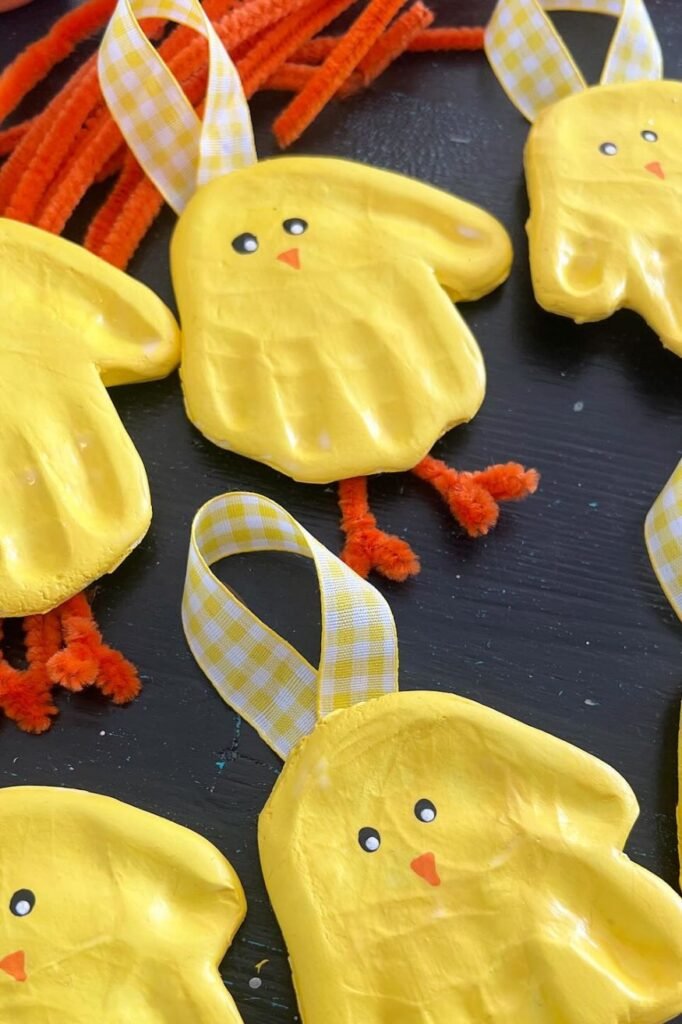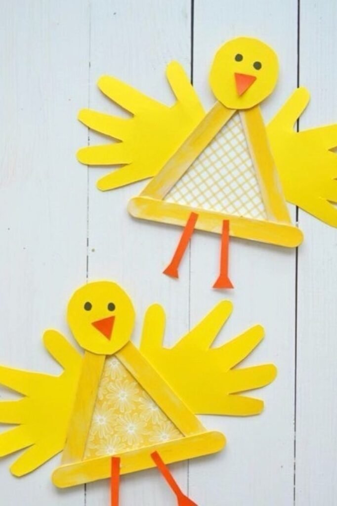 Press the handprints down first then construct the chick’s body with craft sticks and a paper face.