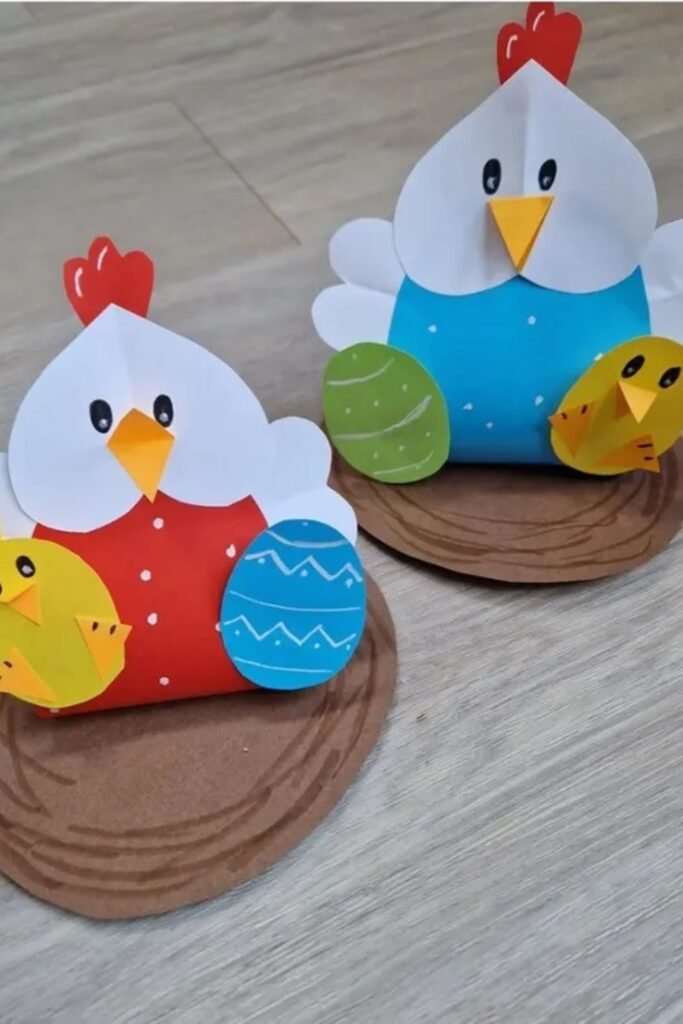 Crafting simple hen shapes is the first step. Then, nestle them on a brown paper “nest,” and add eggs or miniature chicks.
