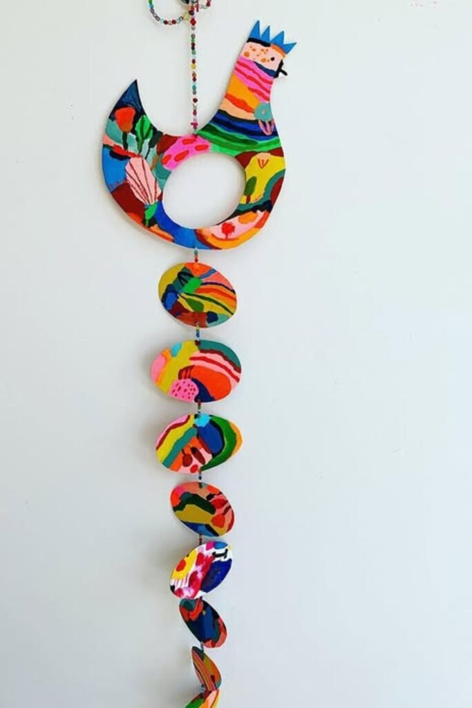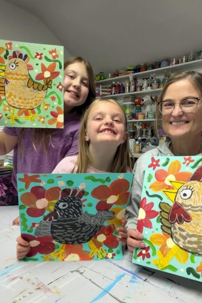 Bold paint strokes keep older kids interested because perfection doesn’t matter here. Start with a simple chicken shape, then let kids layer colors, dots.