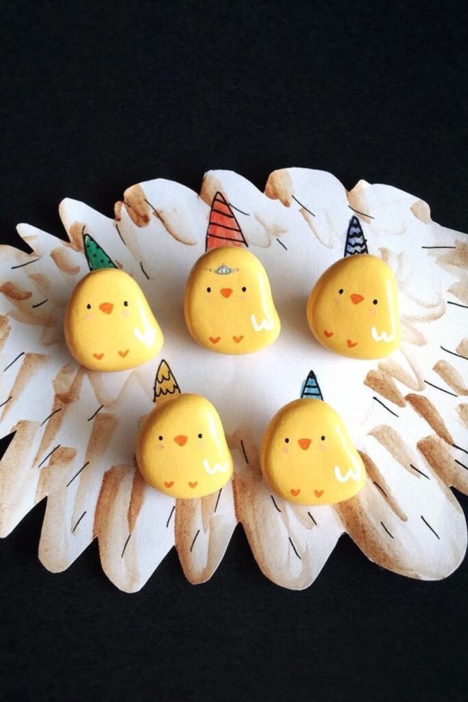 Smooth stones instantly slow kids down because careful painting matters here. Choose rounded pebbles, paint them yellow and add tiny faces once dry.
