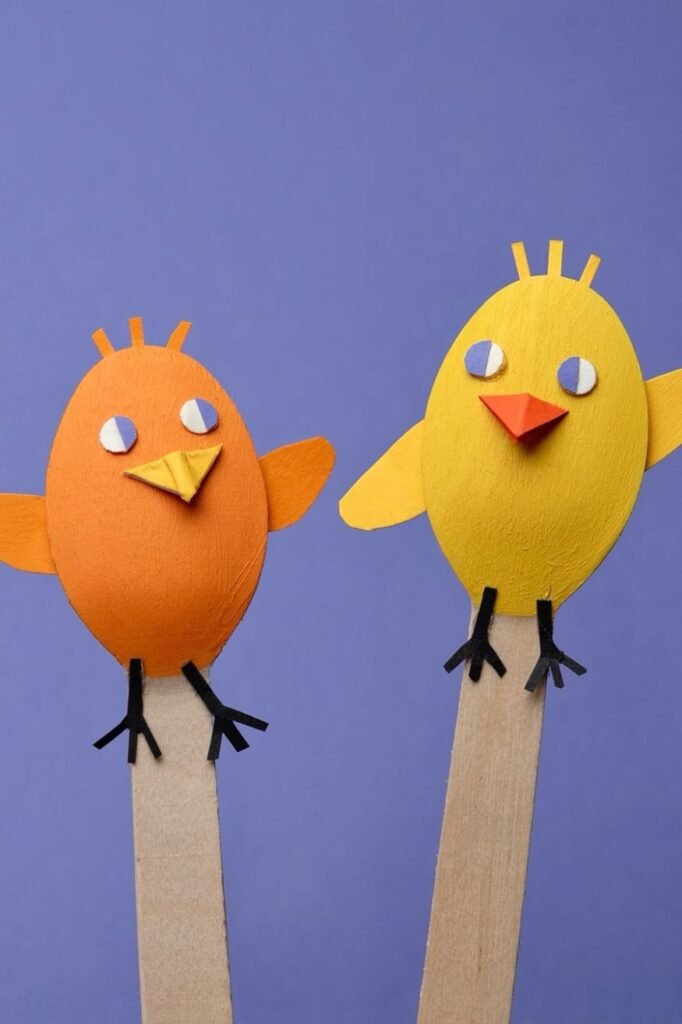 Kids love crafts they can play with right away and stick puppets do exactly that. Paint simple oval chicks glue them onto wooden sticks.