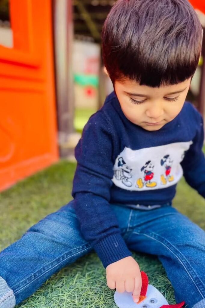Soft felt pieces invite toddlers to slow down and focus without pressure to “finish” anything. Stick a simple chicken face on the floor or table.
