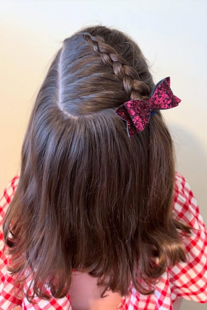 A single side braid tucked neatly into a glittery bow gives short hair a festive twist without much effort.