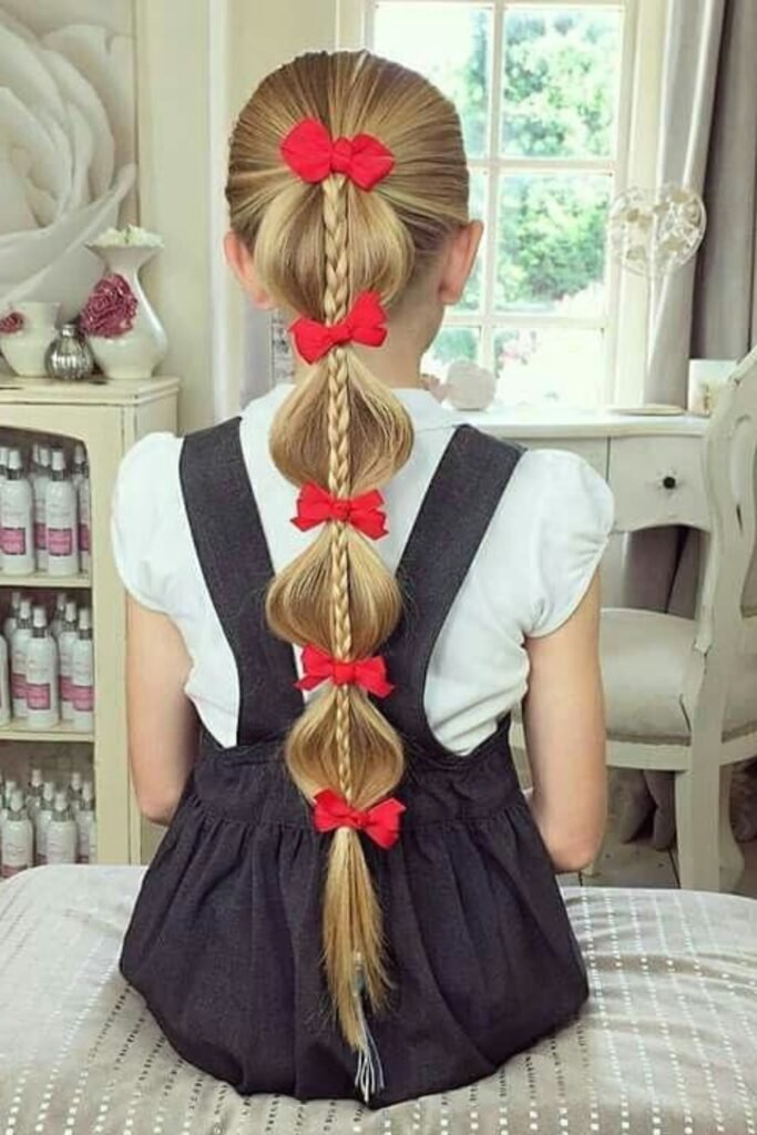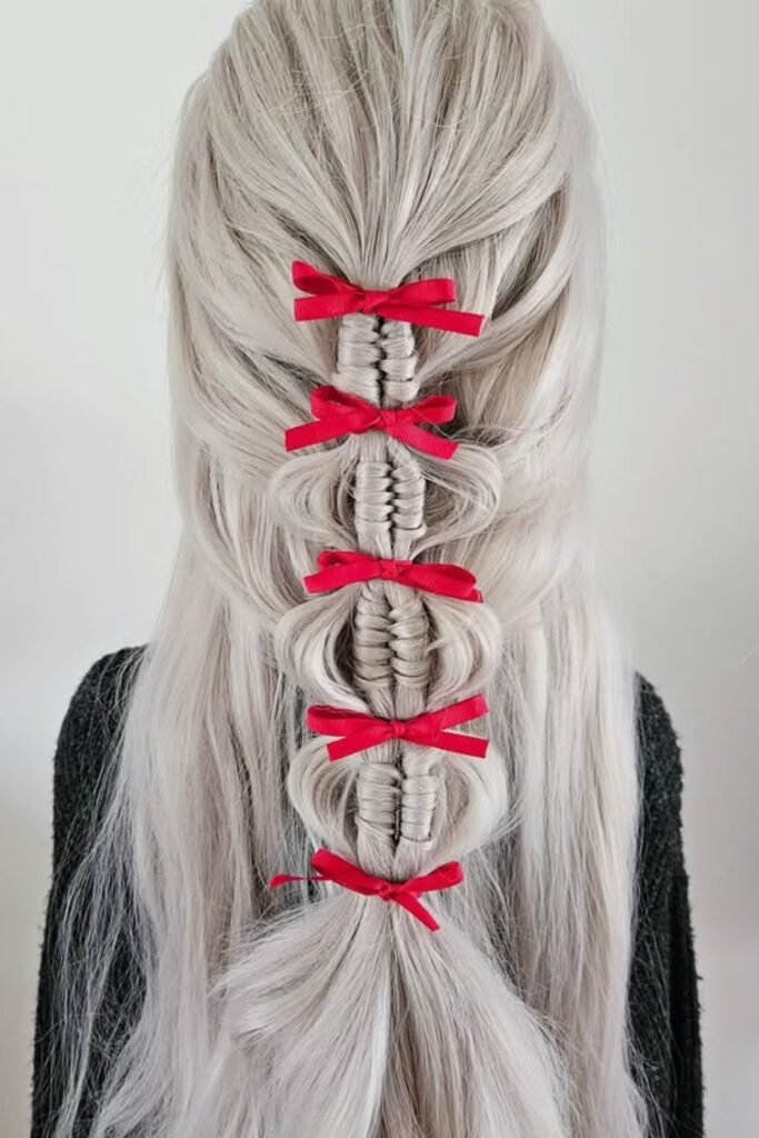 Rows of tiny red bows running down a bubble braid create a show-stopping holiday look.