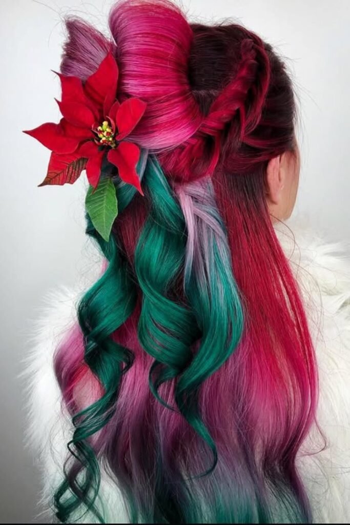 Vibrant pink and green curls paired with a poinsettia clip turn hair into a living Christmas decoration.