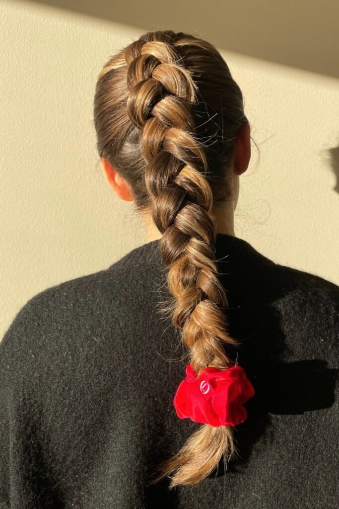 A thick Dutch braid finished with a red scrunchie gives timeless Christmas polish.