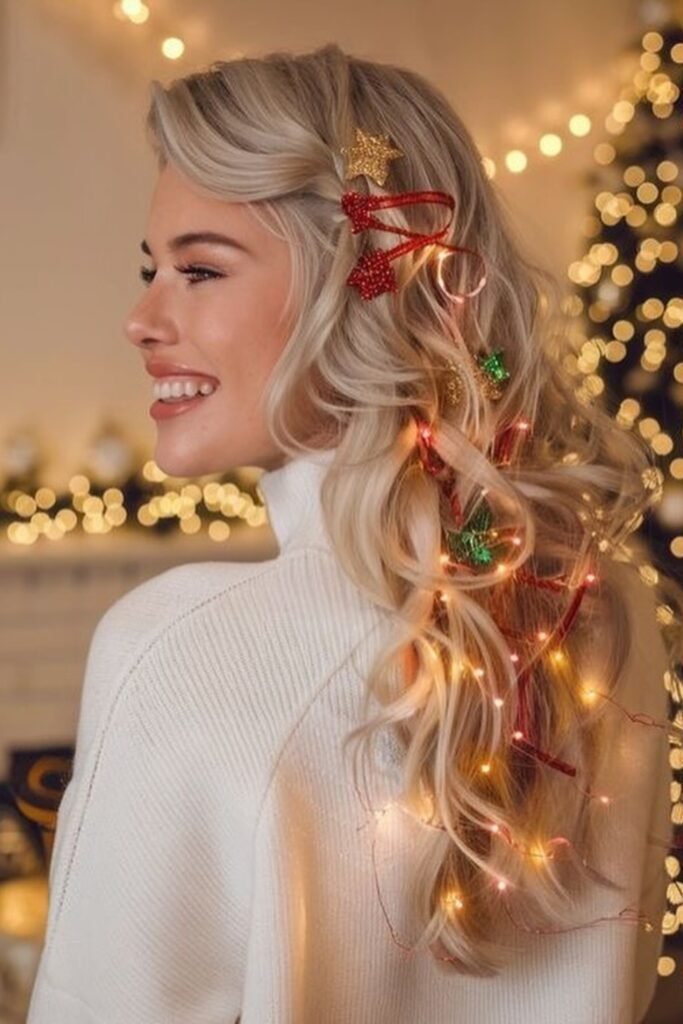 Loose blonde curls lit up with mini string lights and sparkly clips bring instant festive glamour.