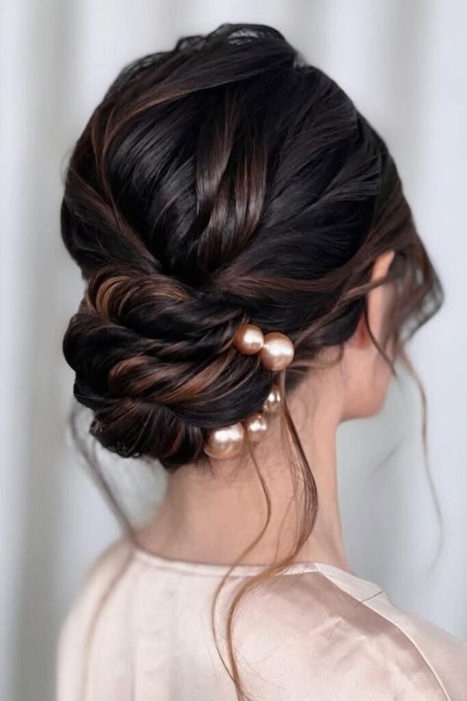 Soft twists gathered into a low bun and accented with pearls create a timeless Christmas-party look.