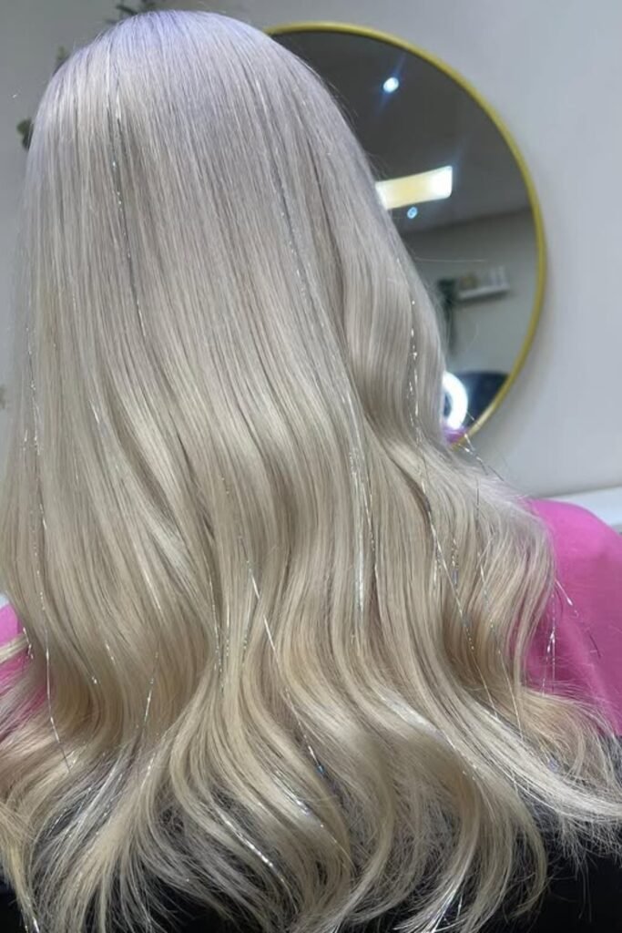 Soft blonde waves threaded with silver tinsel bring a subtle shimmer that catches every bit of holiday light.