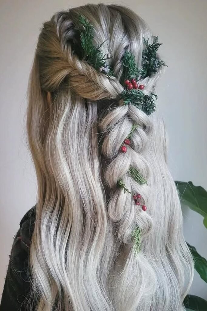 Braiding with small sprigs of greenery turns a simple half-up style into a nature-inspired Christmas look.