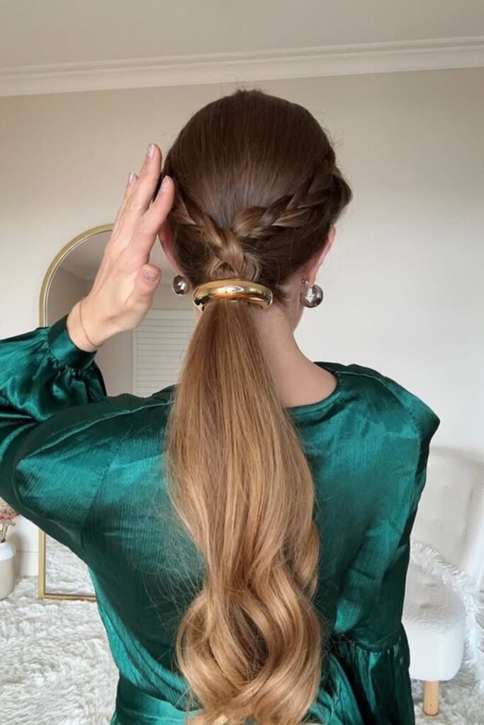 A sleek, braided crown leading into a smooth ponytail finished with a bold, golden clip is perfect for sophisticated holiday gatherings.