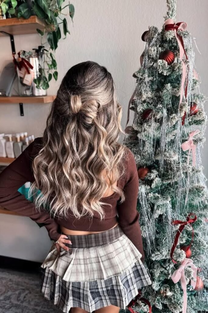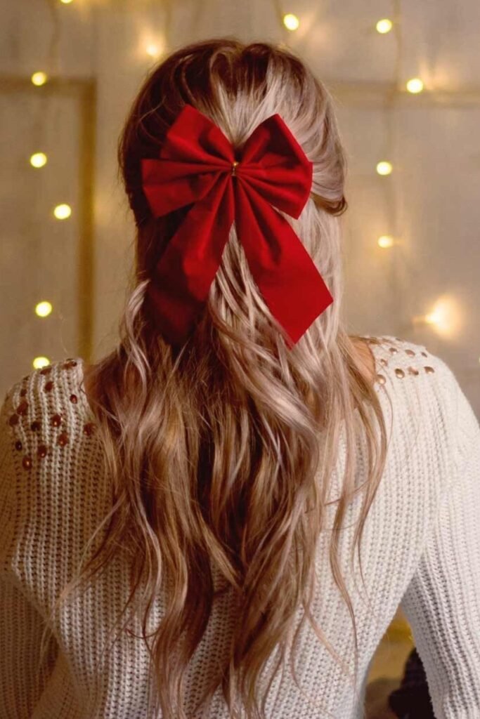 The half-up bow brings it all together: fun, bright, and full of Christmas spirit.