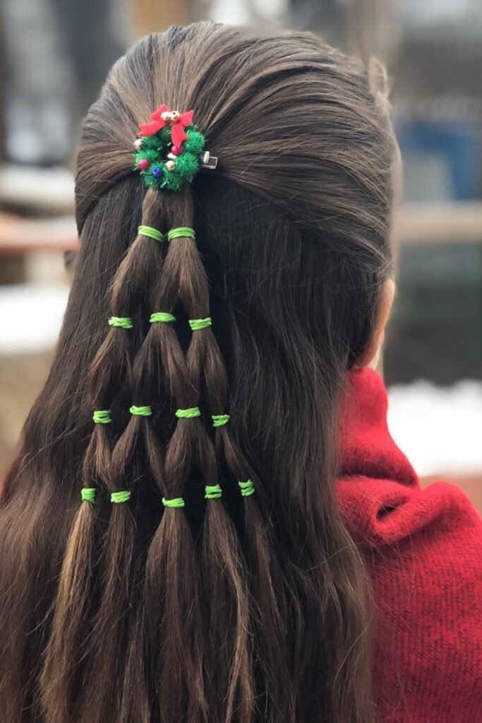 A fun, festive take on a ponytail with green elastics and a small wreath accessory adds a holiday twist that’s playful and charming.