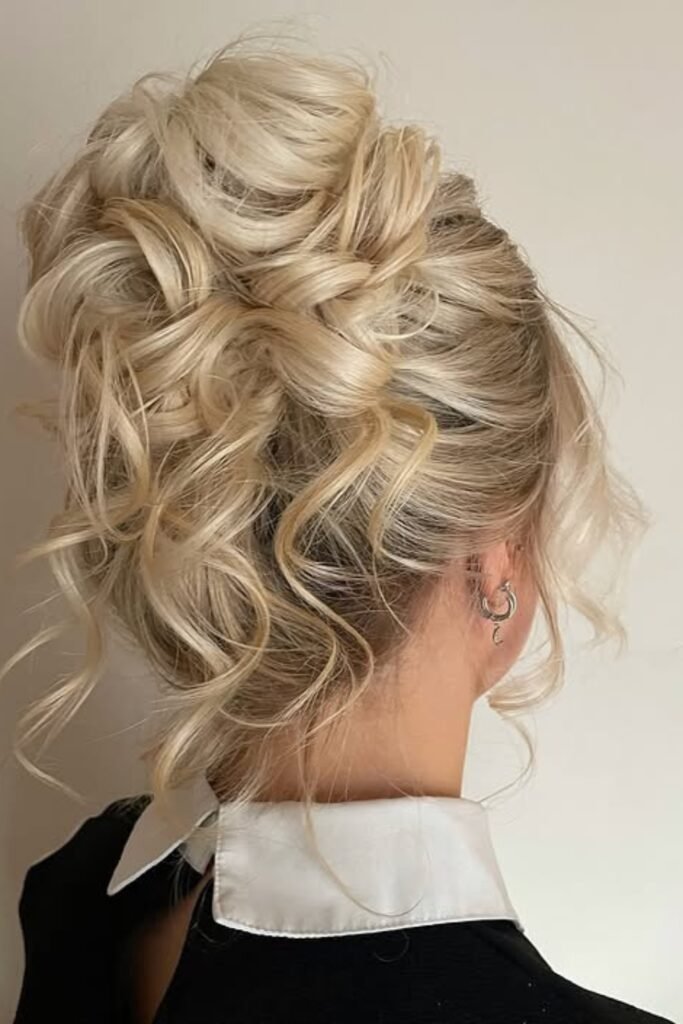 A voluminous, messy updo with soft curls makes this style both festive and romantic.