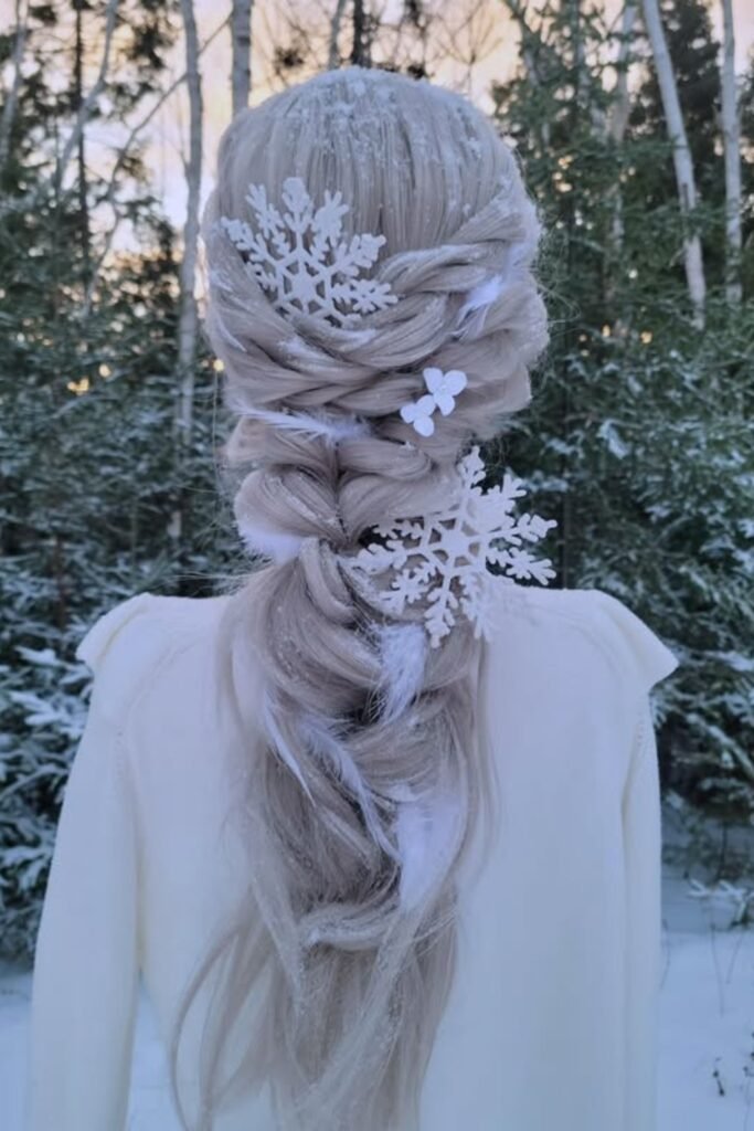 Dreamy winter-inspired braid adorned with snowflake clips creates a whimsical, festive hairstyle that’s perfect for snowy Christmas days or holiday photoshoots.