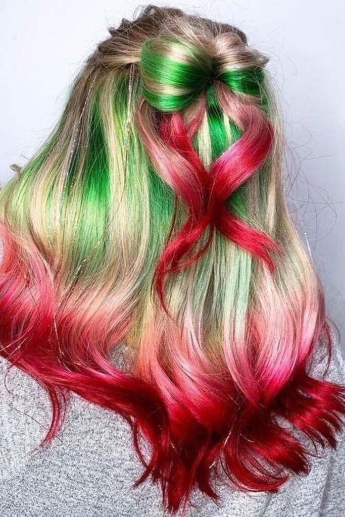 Vivid streaks of red and green give this hairstyle a bold Christmas twist that’s impossible to miss.