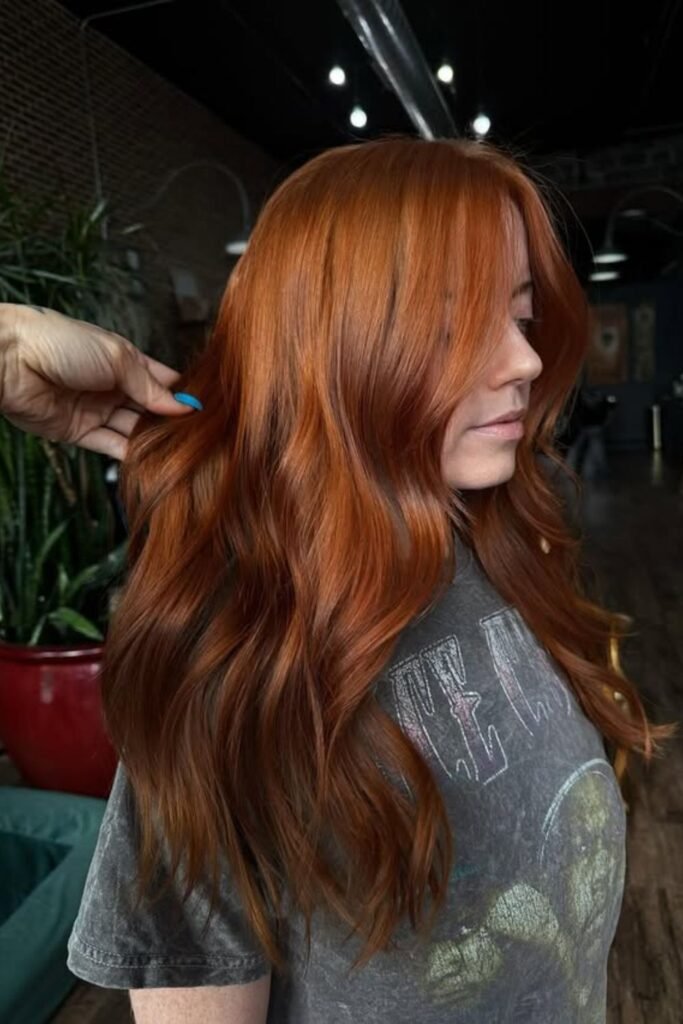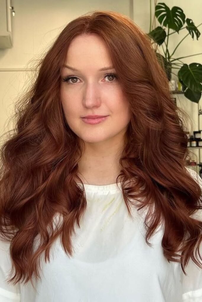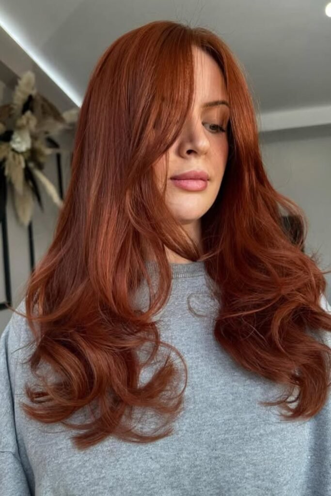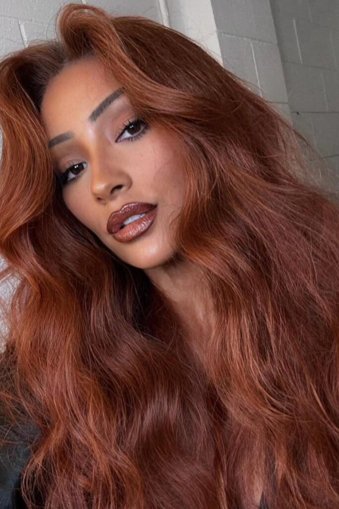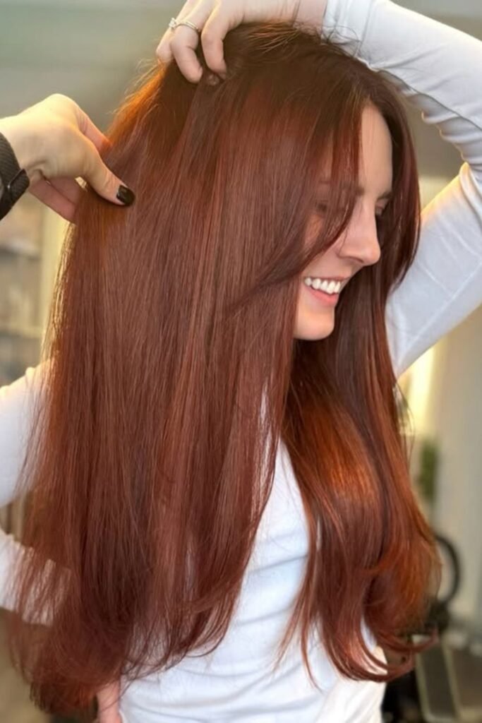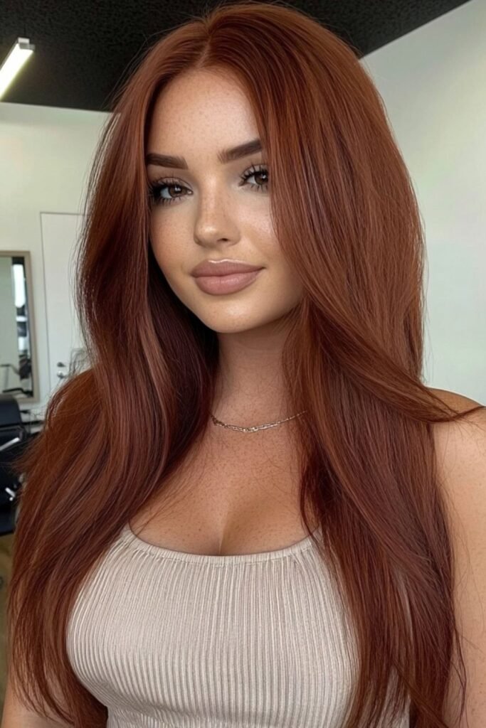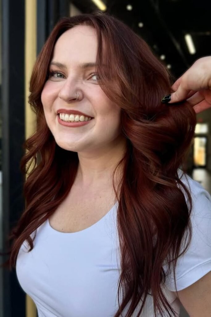 Soft shadow pulls this auburn darker at the roots and richer through the lengths, which keeps the red elegant instead of loud.