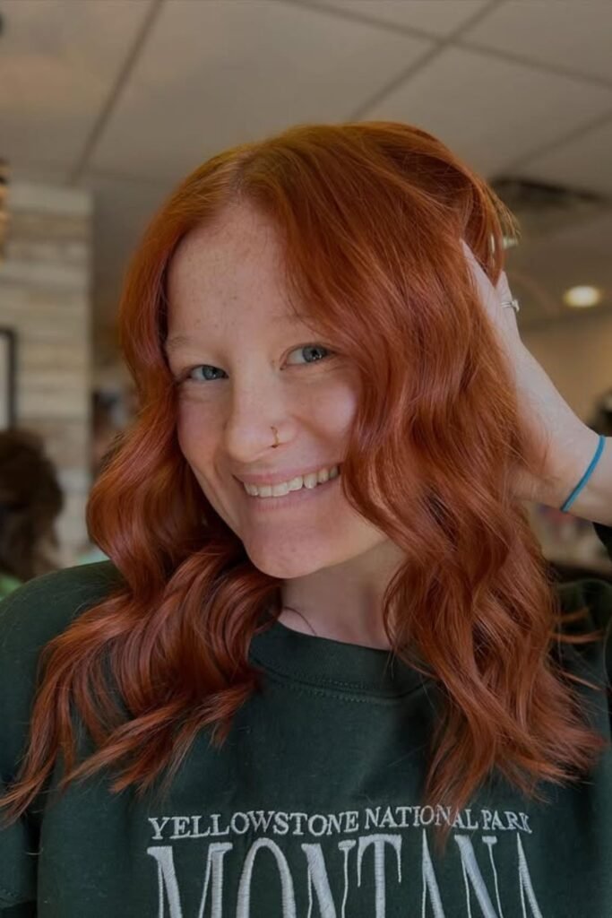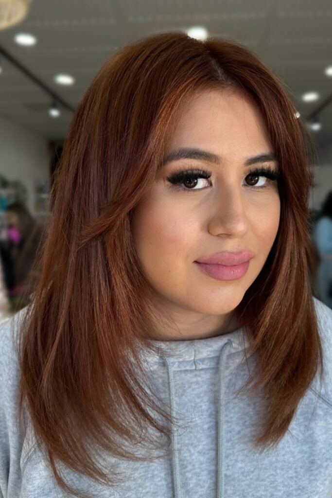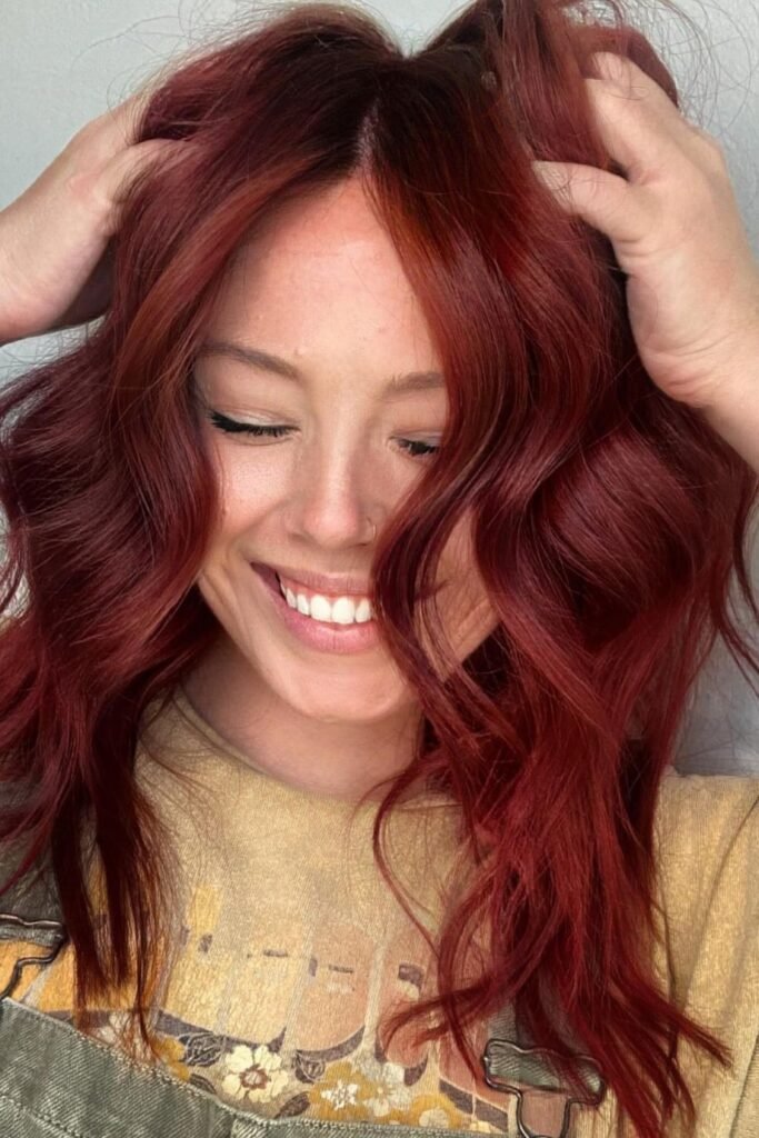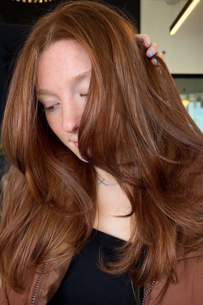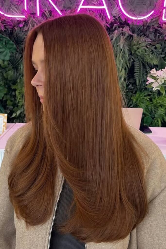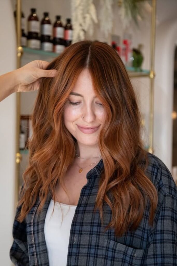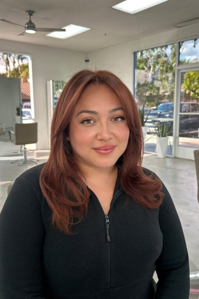 Soft shadow pulls this auburn darker at the roots and richer through the lengths, which keeps the red elegant instead of loud.