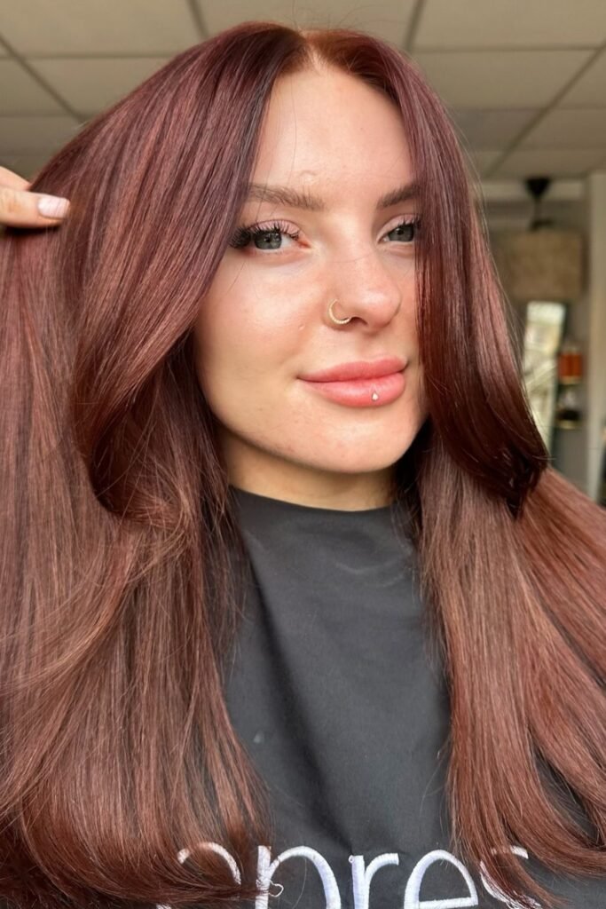 Soft mauve-red tones give this auburn a muted, dusty finish that feels modern instead of fiery.