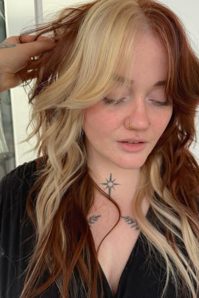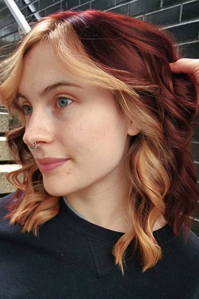 Two tones split the spotlight here, and the contrast works because the auburn stays deep and grounded while the blonde stays soft.