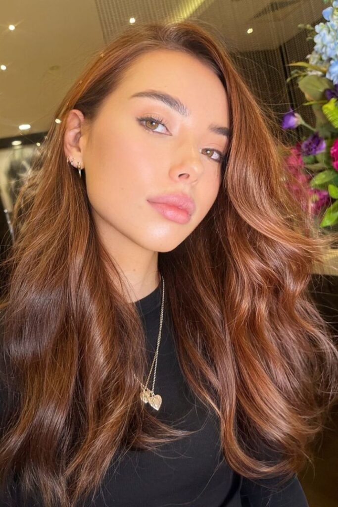 Natural light pulls a smooth mocha-brown tone through this auburn, keeping the red subtle and wearable.