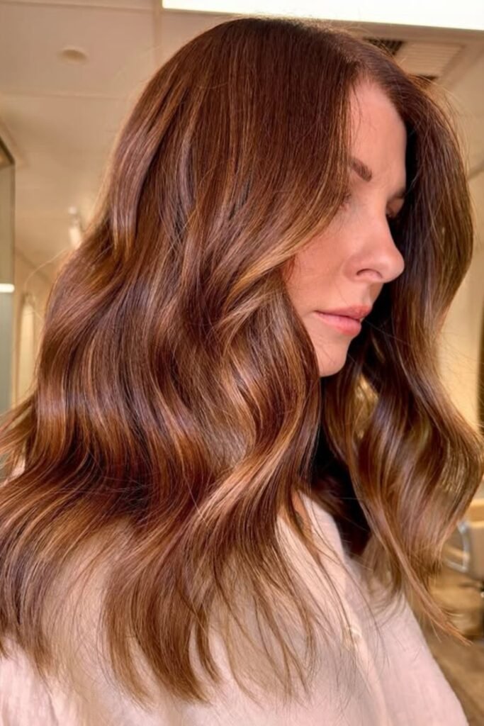 Warm auburn flows through a soft brown base here, giving the color a glowing, beach-lit finish that suits medium to warm skin beautifully.
