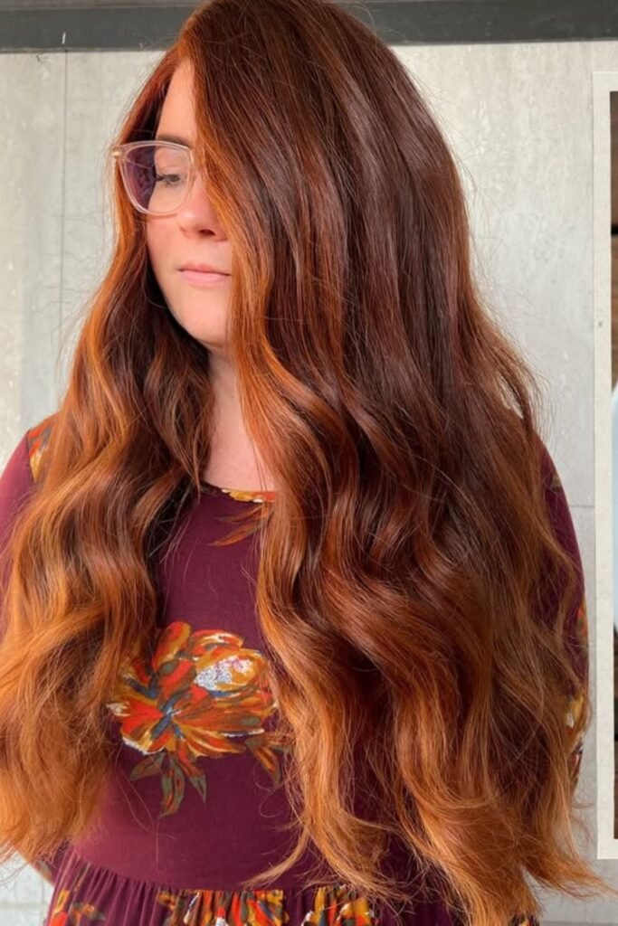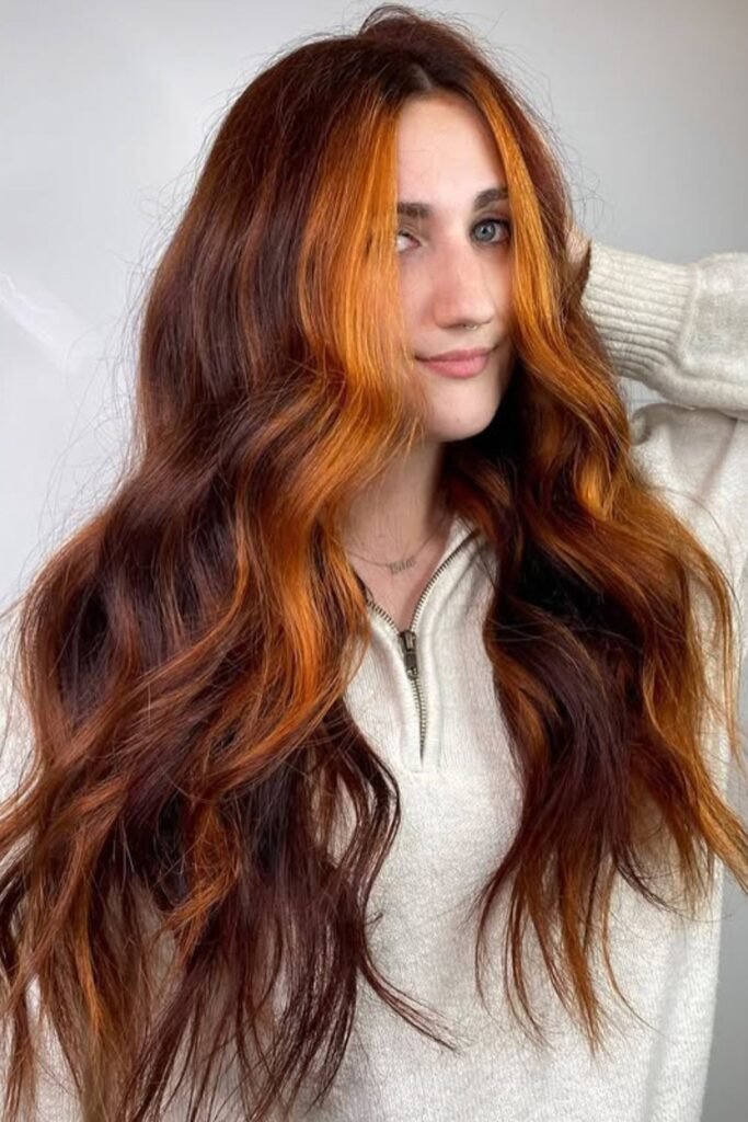 Make it again with a deep auburn base and soft caramel-auburn balayage through the lengths instead of bright copper streaks.