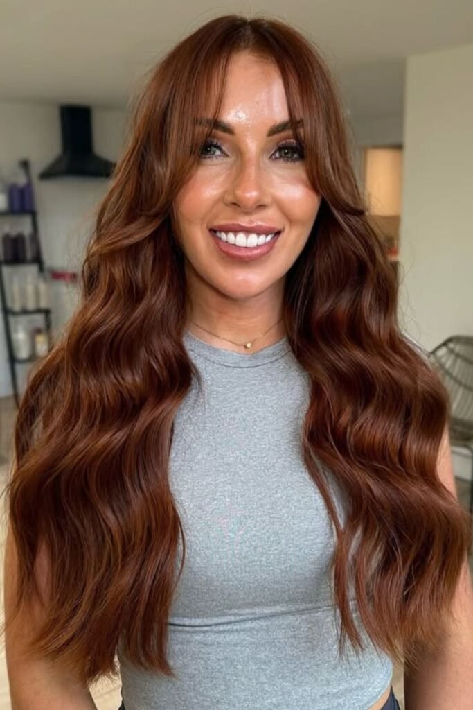 Soft waves carry a rich, even auburn from roots to ends here, giving the color that timeless red-brown balance.