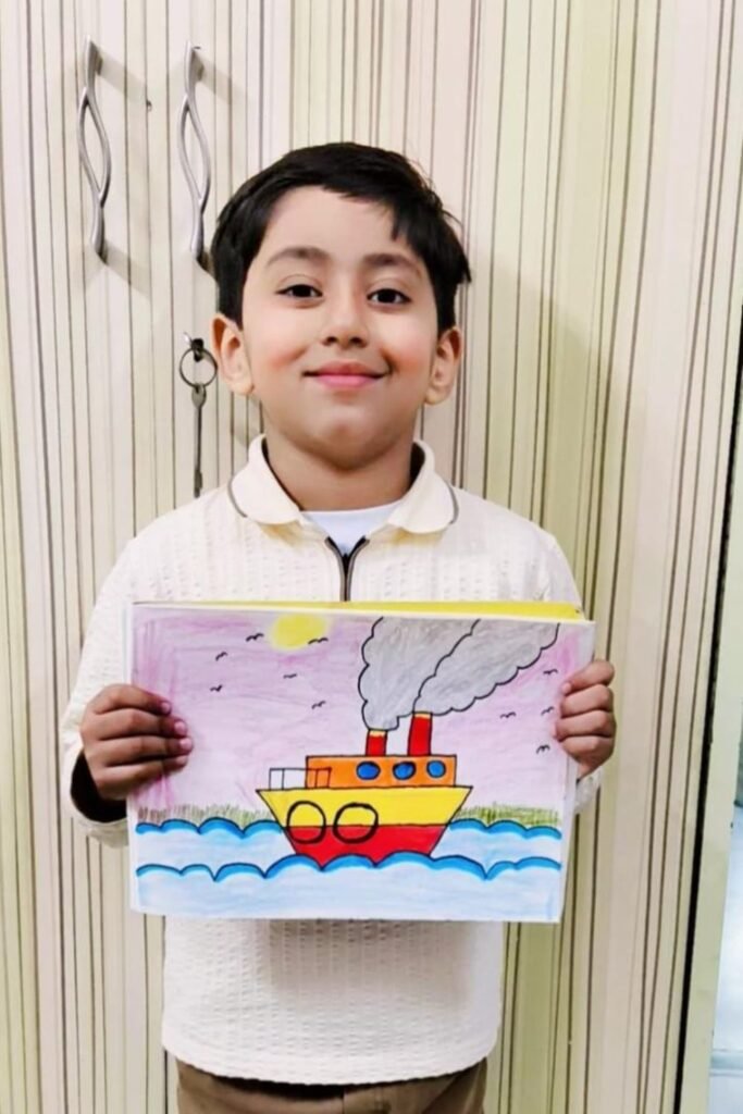 Adventure themes help kids stay focused because the scene naturally unfolds from top to bottom. Begin with a simple boat shape in the middle.