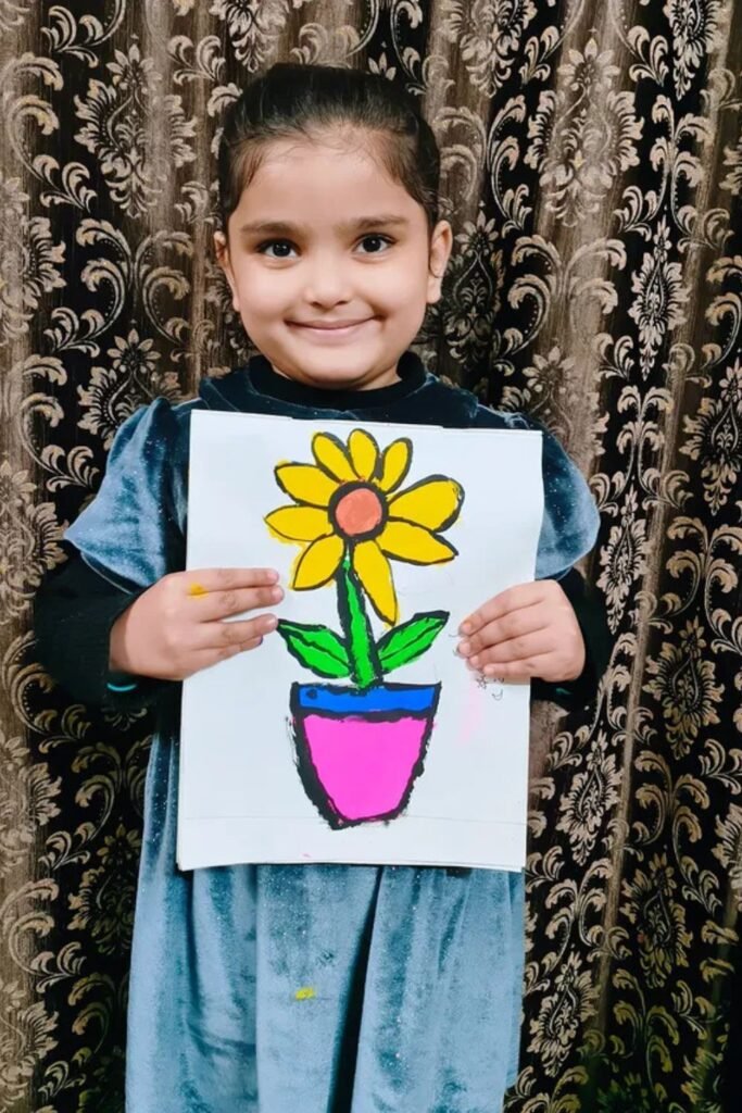 Simple nature drawings give young kids a quick win, which keeps their interest high. Start with a big flower shape, then add a pot underneath.
