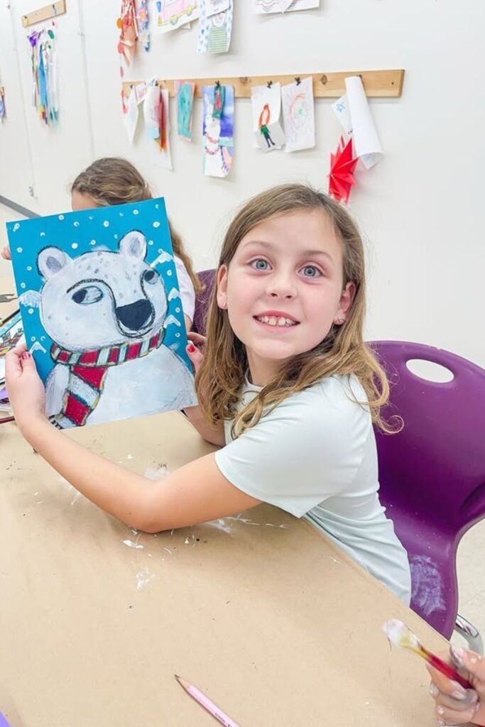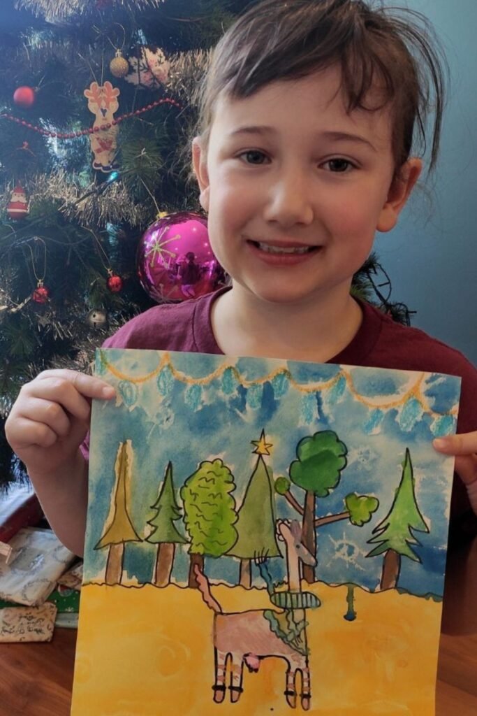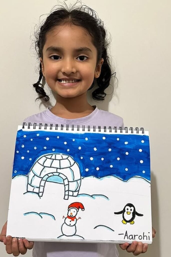 Cold-weather scenes slow kids down in a good way and help them think in layers. Snow, sky and ground give a clear order to follow.