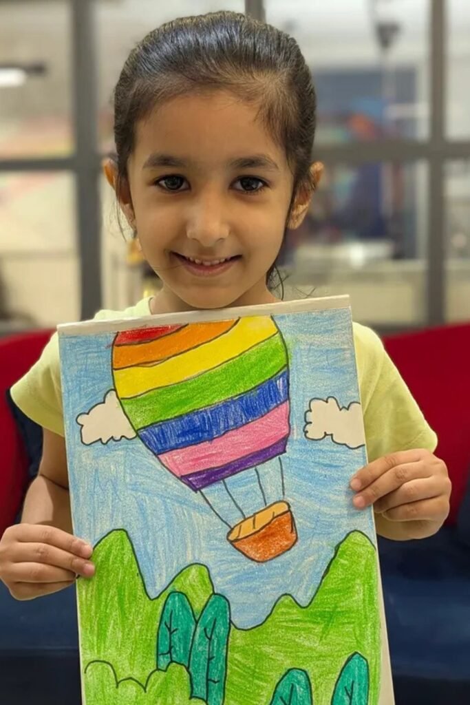Movement on paper keeps kids interested longer, and a floating balloon does exactly that. Start by drawing one big shape in the sky.