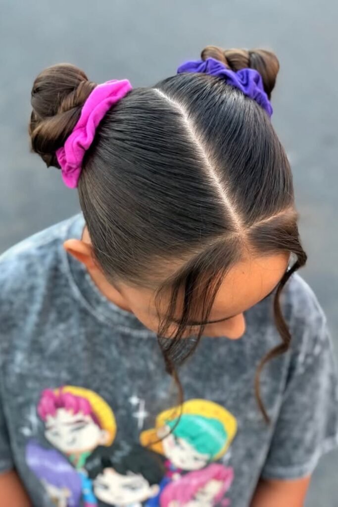 Scrunchie space buns are a fun and quick way to keep hair neat during school mornings. They hold the hair in place while still being fun.