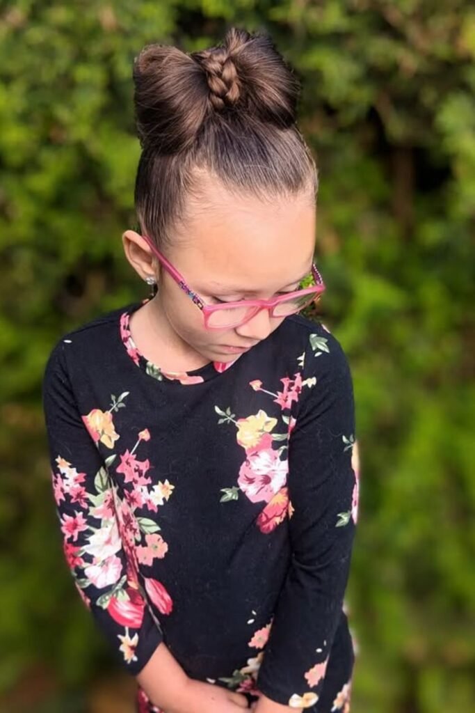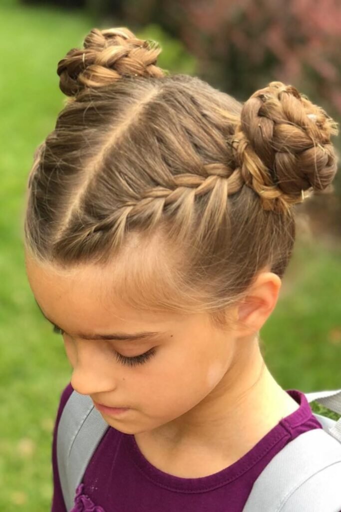 Braided space buns help keep school days clean since the braids hold the style in place from the front to the bun.