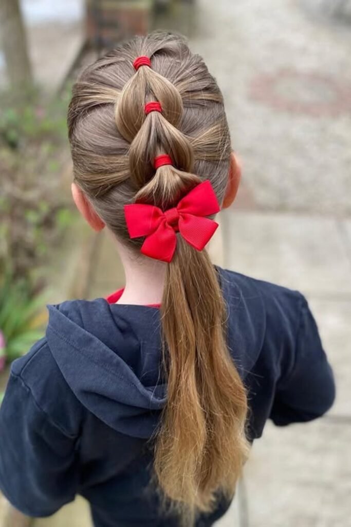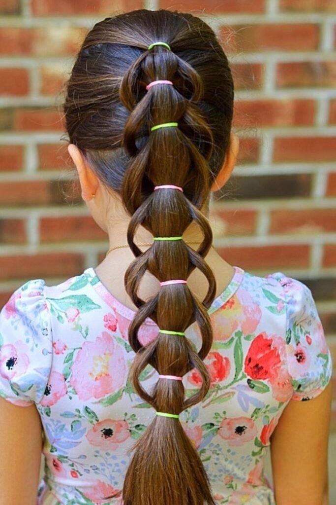 Begin with a little ponytail at the top and tie it with a ribbon. Then, add elastics down the length of the ponytail to make bubbles that are all the same size.
