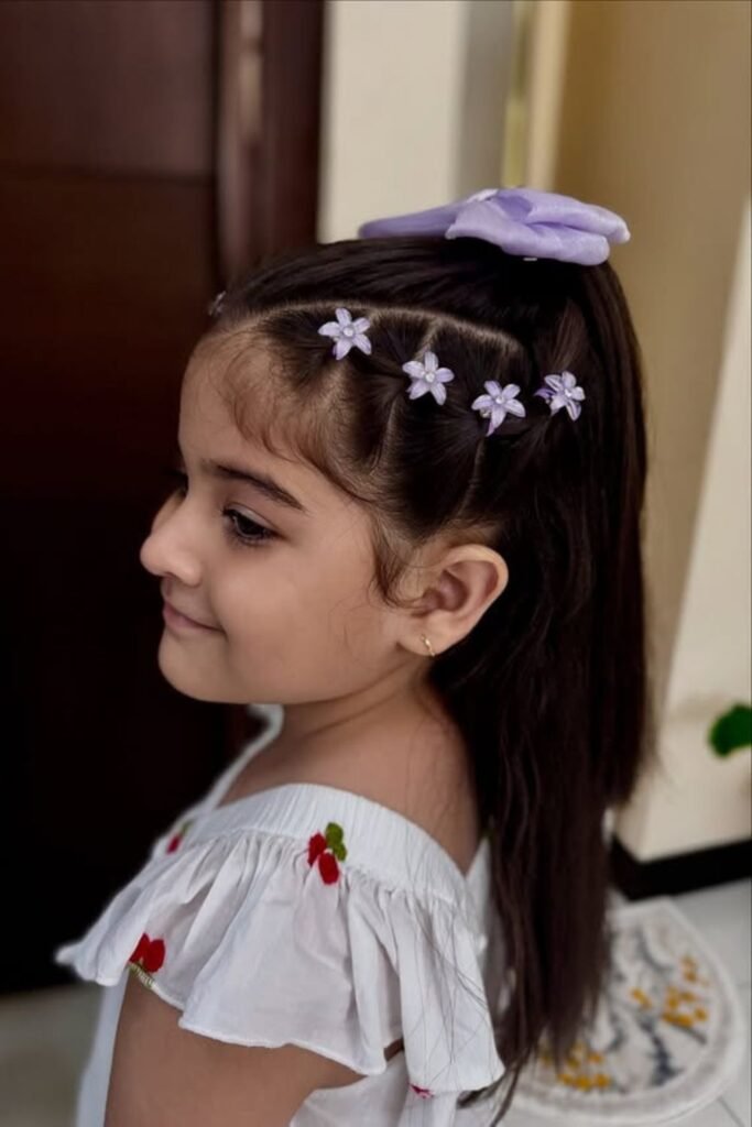 Flower-clip portions make mornings at school feel simpler because the small rubber bands maintain the front in place and the clips give it a gentle, neat look.