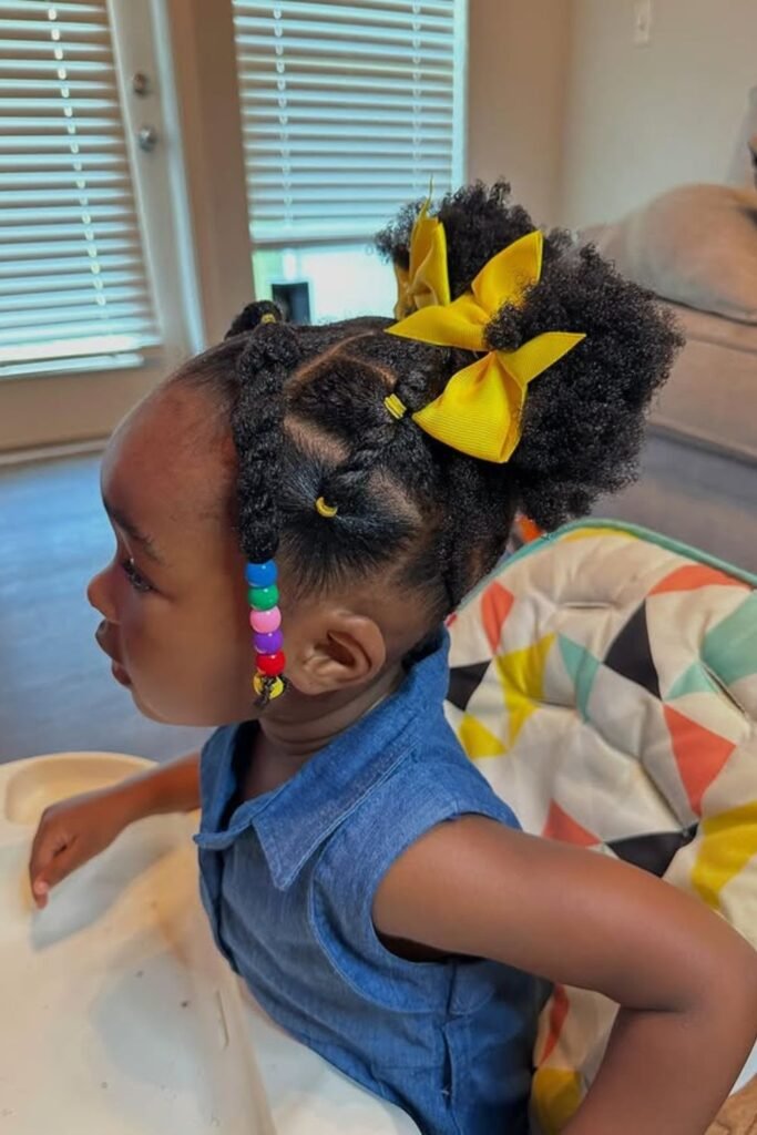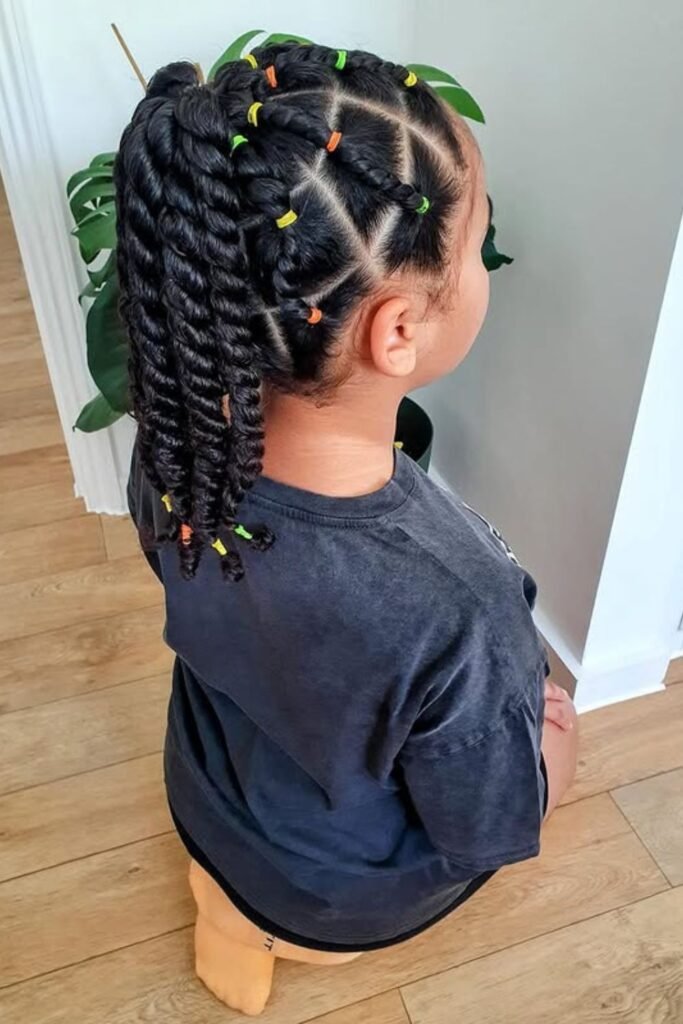 This style is great for thick or coily hair since the twists keep it from becoming tangled, hold moisture, and stay in place during classes, recess.
