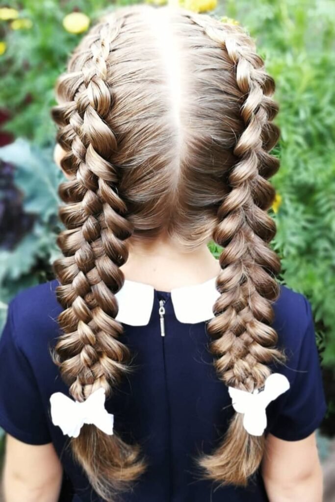 Make a neat middle part, braid each side using a Dutch method that makes the portions stick out, and tie the ends with thin elastics and bows.