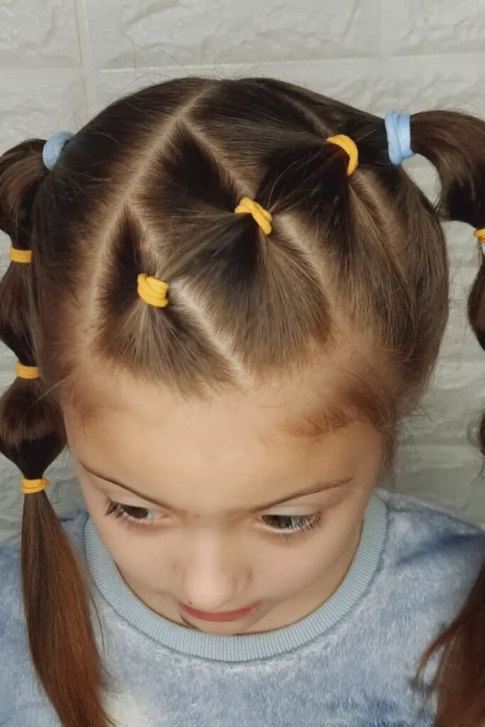 To begin, divide the hair on top into little diagonal parts and tie each one with an elastic band so that they flow into the pigtails.