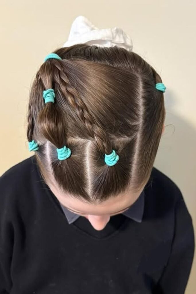 Part the hair straight down the middle, then divide each side into tiny square portions. Use a bright elastic to hold each one in place.