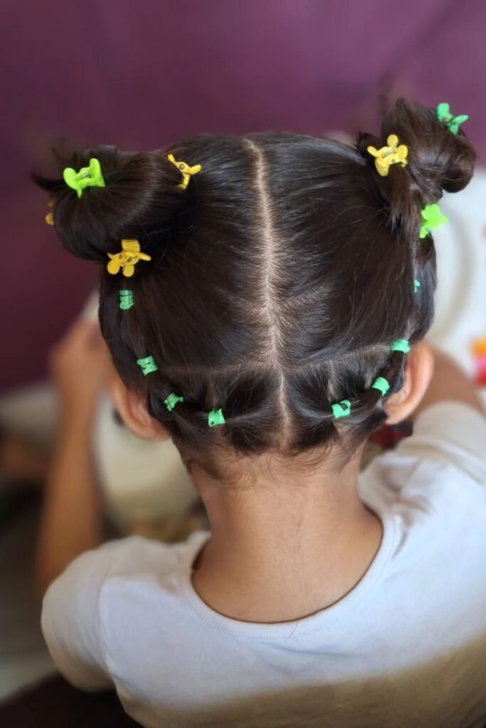 The appearance is finished off with two small buns on top, each with a colorful clip that makes the whole thing look better.